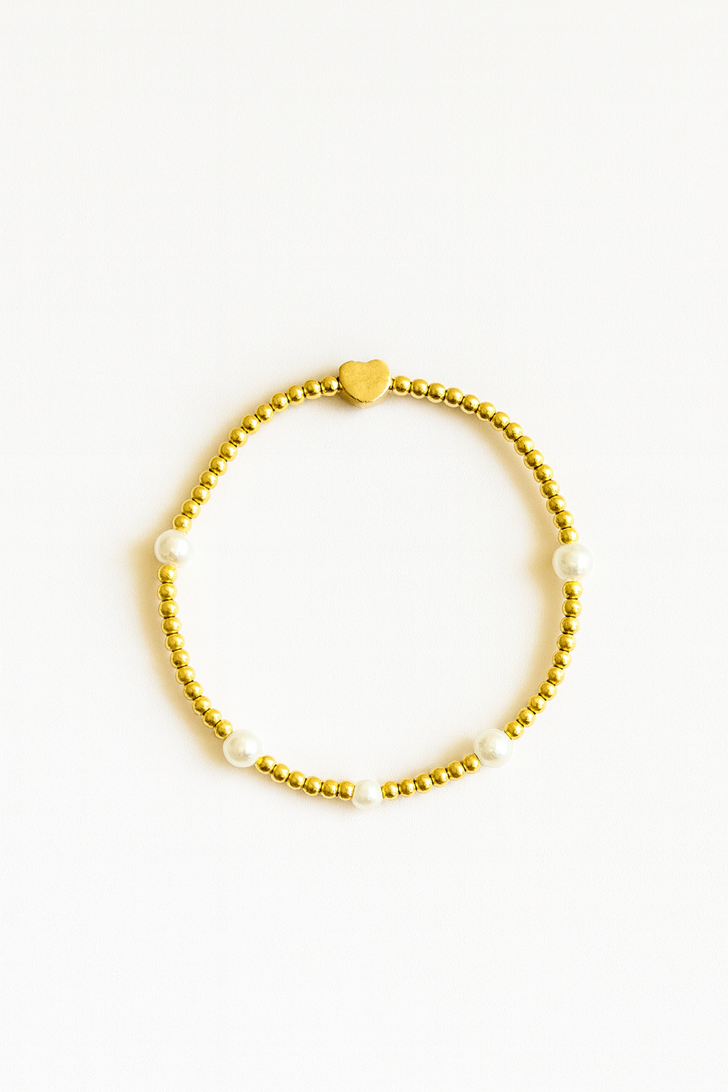 Gold and pearl combo with a sweet gold heart charm. Avoid too much water and chlorine.